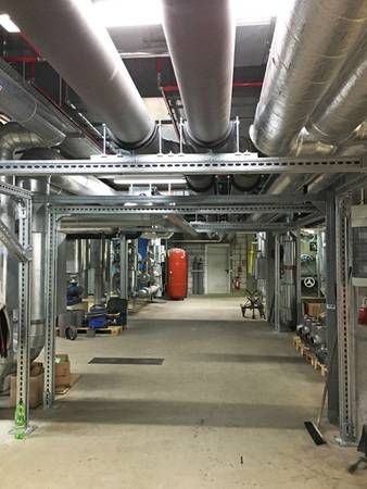 Solch schwere Installationen für die Technische Gebäudeausrüstung (TGA) lassen sich mit dem massiven Schienensystem FMS besonders flexibel und effizient umsetzen. Damit erübrigt sich die Befestigung mit einer aufwändigen Stahlbaukonstruktion, die eine eigene Planung und Vorfertigung erfordert sowie oft zu Bautoleranzen vor Ort führt.