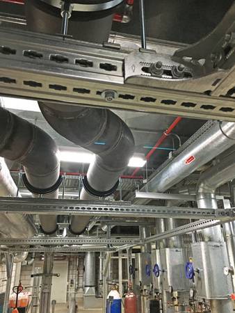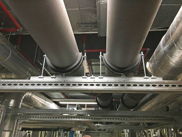 Die Kältetrasse ließ sich mit dem neuen Fischer Massiven Schienensystem FMS erfolgreich installieren. Dieses Installationssystem eignete sich gut zum Einleiten der hohen Lasten des Kälteleitungspaars mit einem inneren Durchmesser von 250 mm (Nennweite DN250) unter Berücksichtigung der erforderlichen Spannweite der Rahmenkonstruktion.