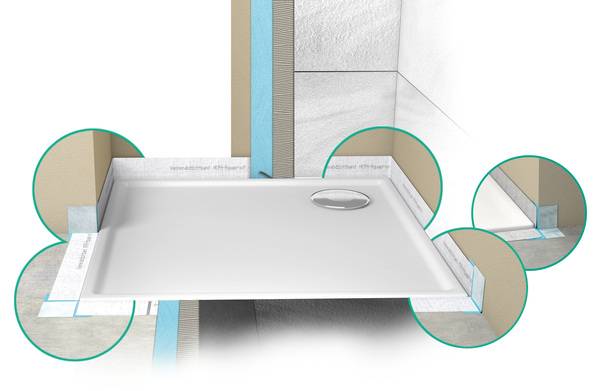 Zur sicheren Abdichtung der verschiedenen Übergänge bei komplexen Einbausituationen wie zum Beispiel bodengleichen Duschen ist die 3D-Ecke erforderlich. Die Aquaproof 3D-Ecken mit vorgenuteten Laschen für eine einfache Verarbeitung werden von außen an das Wannenabdichtband angebracht und geben der Abdichtung die richtige Passform für die jeweilige Einbausituation.