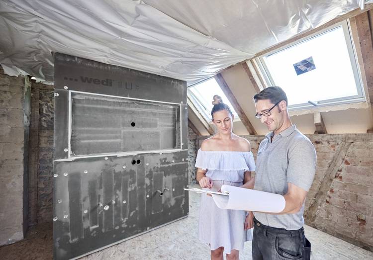 Wie sehr diese Vorteile im Beratungsgespräch überzeugen, bestätigte sich für Ulrich Bergmann beim Sanierungsprojekt der Familie Diemer, ebenfalls aus Mosbach. „Ursprünglich“, so Bergmann, „sollten wir die Badsanierung gar nicht machen, sondern nur die Planung dafür. Es war also unsere Expertise gefragt, im Dachgeschoss eines Hauses aus den 30er Jahren ein 16 m² Traumbad zu bauen.“
