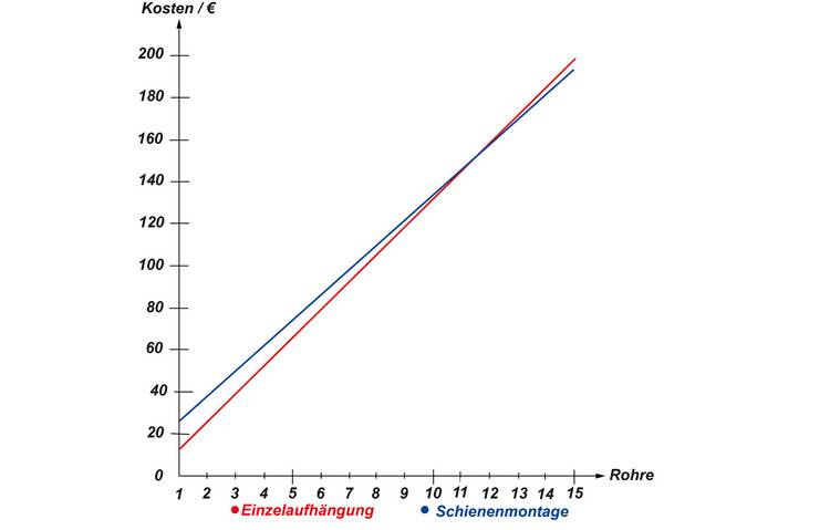 Jetzt lassen sich Vergleichskosten für Einzelabhängungen und die Schienenmontage über die Zahl der Rohre in einem Schaubild als Geraden darstellen. Bei einem Stundensatz von 60 Euro schneiden sich die Geraden zwischen elf und zwölf Rohrleitungen. Allerdings ist der Winkel zwischen diesen Geraden flach.