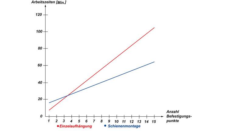 Beim Vergleich der Arbeitszeit sehen die Verhältnisse anders aus. Hier liegt der Schnittpunkt bei einer geringen Anzahl von Rohrleitungen. Das heißt: Bei vergleichbaren Gesamtkosten für den Bauherrn spart der ausführende Betrieb bei der Schienenmontage Arbeitszeit ein.