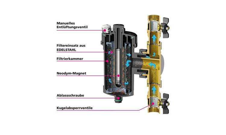 Das Anlagenwasser durchströmt den Abscheider und fließt durch den Filtereinsatz aus Edelstahl. In der Filtrierkammer strömt das Wasser durch einen feinmaschigen Filtereinsatz, vorbei an einem 11.000 Gauß-starken Neodym-Magnet.
