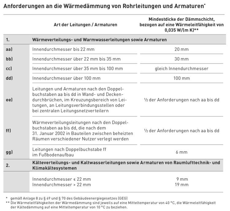 In Abhängigkeit des Einsatzbereiches und des Rohrinnendurchmessers ergeben sich die bekannten Dämmniveaus: 100%-Dämmung (1aa – dd), 50%-Dämmung (1ee und ff), Rohrdämmung im Fußbodenaufbau (1gg), 200-% Dämmung für an Außenluft grenzende Rohrleitungen (1hh) und die Dämmung von Kälteverteilungs- und Kaltwasserleitungen von Raumlufttechnik- und Klimakältesystemen (2). Für Kälteverteilungs- und Kaltwasserleitungen gelten jetzt allerdings deutlich erhöhte Anforderungen. Kälteverteilungs- und Kaltwasserleitungen sind nach dem neuen GEG bei einem Innendurchmesser von bis zu 22 mm mit einer Mindestdämmschichtdicke von 9mm zu dämmen und ab einem Innendurchmesser von mehr als 22 mm beträgt die Mindestdicke der Dämmschicht 19mm. Diese Mindestanforderungen beziehen sich auf eine Wärmeleitfähigkeit des Dämmstoffs von 0,035 W/(m K) bei einer Mitteltemperatur von 10°C.