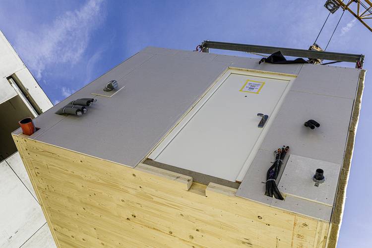 Neben den ökologischen Aspekten öffnet der Holzbau zudem neue Horizonte beim Vorfertigungsgrad mehrgeschossiger Gebäude. Das beweist ein Pionier auf dem Gebiet des Modulbaus aus Massivholz. Das Unternehmen Kaufmann Bausysteme aus dem österreichischen Reuthe (Vorarlberg) ist unter anderem für den Neubau des Studentenwohnheims in Göttingen mit 200 Wohneinheiten und einer Gebäudehöhe bis 12,70 m verantwortlich.