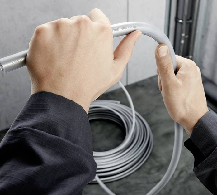 Für die Heizungsverteilung ist beispielsweise das Rohrleitungssystem Raxofix von Systemanbieter Viega gut geeignet. Es bietet gerade im Holzbau viele Vorteile. Das Mehrschichtverbundrohr besteht aus einem Kunststoff-Außenmantel, einer Aluminiumschicht und einem Kunststoff-Innenrohr. Damit ist es sehr gut zu biegen, aber dennoch resistent gegen Knicke. Zudem bleibt das Rohr nach dem Biegen stabil in der Form.
