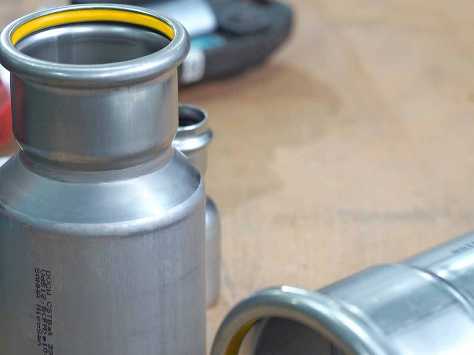 Das System NiroSan Gas wird aus dem Werkstoff 1.4404 gefertigt. Es enthält mindestens 2,3 Prozent Molybdän und einen gegenüber 1.4401 reduzierten Kohlenstoffgehalt. Dadurch überzeugt es zusätzlich durch seine höhere Korrosionsresistenz. Durch die Dimensionen von 15 bis 108 mm lassen sich Projekte in so gut wie allen Größen umsetzen.