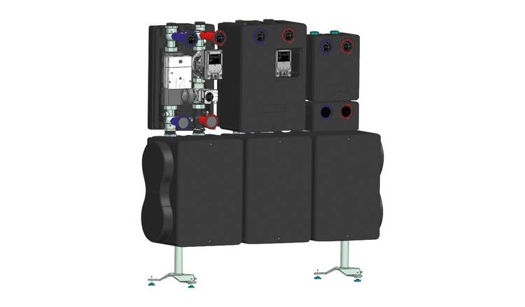 Neu sind die Heizkreisverteiler HKV2/G2/DN125 und HKV3/G2/DN125 für die Montage von zwei oder drei Sets HS40 oder HS50. Ein großer Vorteil: Mit ihren Flanschverbindungen lassen sich die Heizkreisverteiler untereinander kombinieren. So ist eine Sechser-Kaskade möglich, mit der maximal 1200 kW übertragen werden können. Buderus hat die Installation in der Praxis mit Handwerkspartnern getestet – die Kaskade mit sechs Heizkreissets war an einem Vormittag aufgebaut, es fehlten nur noch die elektrischen Anschlüsse. Dies bedeutet eine erhebliche Zeitersparnis gegenüber der klassischen Erstellung einer Heizkreisverteilung.