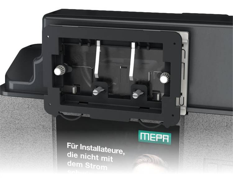 Der im Lieferumfang der entsprechenden Betätigungsplatten enthaltene Montagerahmen ist mit Rändelschrauben gegen Herausfallen gesichert. Mepa hat ihn mit modifizierten Drückerstangen ausgestattet, die so tief wie erforderlich bis zum Tiefenanschlag eingeschoben werden können.