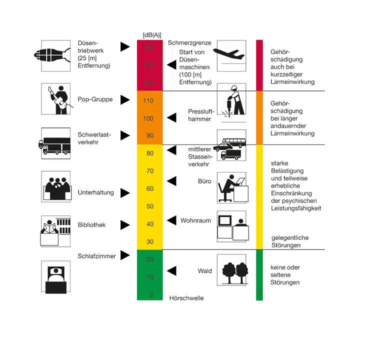 Ausgehend von einer Geräuschquelle breitet sich Luftschall gleichmäßig in alle Richtungen aus. Die Raumbegrenzungen und Einbauten reflektieren die Schallwellen teilweise. Beim Auftreffen auf feste Körper wandelt sich der nicht reflektierte Teil in Körperschall um, der dann über Bauteile wie Decken und Wände in benachbarte Räume weitergeleitet und dort wiederum als Luftschall abgestrahlt wird.
