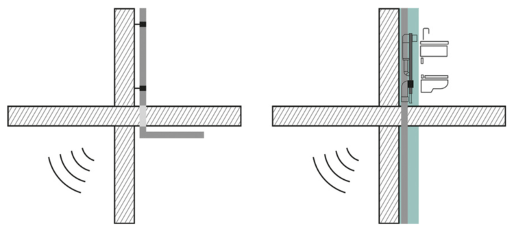 Doch auch bei der Abwasserinstallation kann durch Schallbrücken – wenn die Rohre ohne Dämmung mit dem Baukörper in Berührung kommen oder durch eine mangelhaft ausgeführte Befestigung – Körperschall entstehen. Körperschallübertragungen (Schallbrücken) können physikalisch nicht komplett vermieden werden. Es lassen sich jedoch gute Ergebnisse erzielen, in dem die haustechnischen Installationen vom Baukörper akustisch entkoppelt werden. Das kann mit verschiedenen technischen Lösungen erreicht werden.