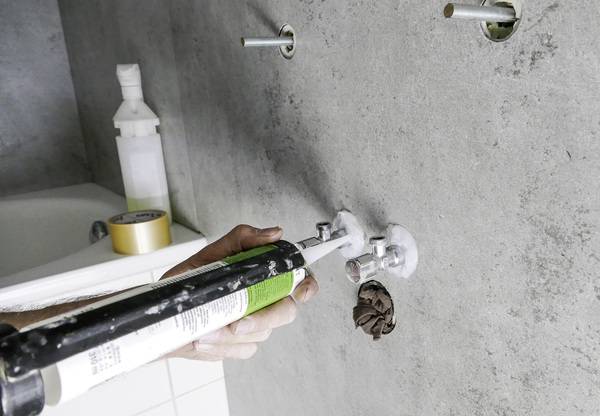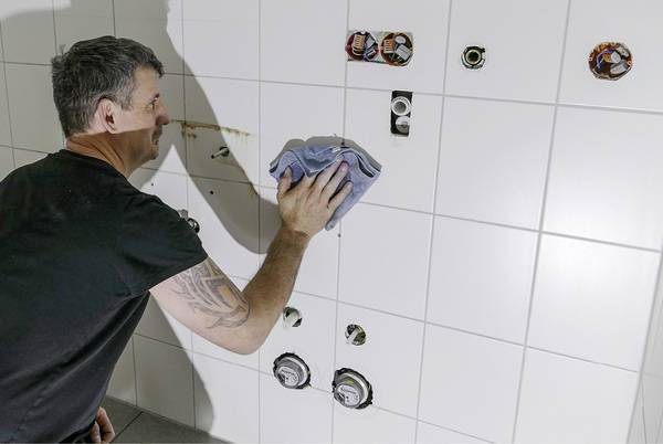 Sind die Rückwände mit den Profilen auf der Wand, werden die Armatur und die Duschabtrennung installiert. Hier sind die üblichen Arbeitsschritte auszuführen. Allerdings muss der SHK-Fachmann bei Bohrungen in den Rückwänden beachten, dass er sie mindestens 4 mm größer bohrt. Für einen 6er-Dübel wird z. B. eine 10er-Bohrung gesetzt. Dübel sollen nicht in der Rückwand verspannt oder aufgespreizt werden, sondern im Untergrund. Alle Durchführungen und Kanten rundum zur Wand werden schließlich mit Silikon abgedichtet.