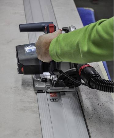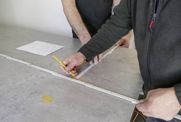 Alle Maße werden anschließend mit einem wasserlöslichen Folienstift auf die Frontseite der Platten übertragen. Der Zuschnitt lässt sich mit üblichen Bearbeitungsgeräten wie Handkreissägen, Stichsägen oder Bohrmaschinen ausführen. Die Sägeblätter für die Metallbearbeitung müssen scharf sein. Es empfiehlt sich, die Platten beim Sägen vollflächig aufzulegen. Die Öffnungen für Warm- und Kaltwasser oder das Unterputzelement sind um ca. 2 mm größer zu bohren als der Durchmesser. Auf diese Weise wird der Kontakt zwischen Platte und durchgeführtem Element vermieden. Die Profile werden anhand der ermittelten Maße ebenfalls in der Länge angepasst.