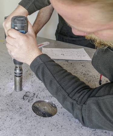 Wurden alle Schnitte ausgeführt und die Öffnungen hergestellt, sollte vor dem eigentlichen Anbringen der Platten eine Kontrolle erfolgen und die Elemente auf die Wand gehalten werden. Zu diesem Zeitpunkt lässt sich noch nachbessern, etwa wenn der Durchmesser für die Wasseranschlüsse nicht exakt passt. Alle Schnittflächen und Kanten sind zu entgraten, die Bohrungen werden angesenkt.
