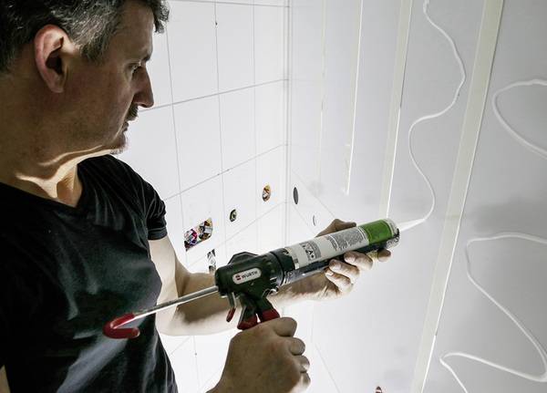 Grundsätzlich gibt es zwei Möglichkeiten, die Deco-Motion-Rückwände zu befestigen, entweder mit Installationskleber (säurefreies bzw. neutral vernetzendes Silikon) oder mit einem Flächenkleber. Zunächst wird immer die Schutzfolie von der Rückseite entfernt. Wird mit Silikon gearbeitet, wird anschließend Spiegelklebeband mit ca. 20 mm Abstand an den Außenkanten und rund um alle Öffnungen aufgebracht. Auf der Fläche werden die Klebebahnen mit ca. 400 mm Abstand angesetzt und fest angedrückt. Zuletzt wird auf die komplette Rückwand Installationskleber in Wellen aufgetragen, außerdem rund um alle Öffnungen. „Eine hohe Sorgfalt zahlt sich an dieser Stelle aus“, erklärt Peter Funk. „So wird verhindert, dass Wasser hinter die Platten dringt.“