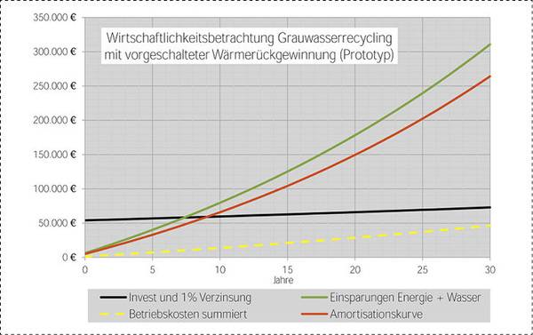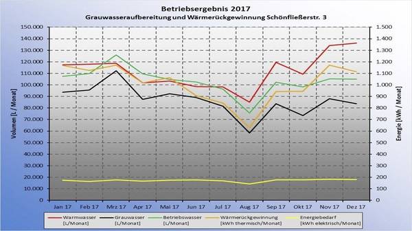 Pro Kubikmeter Betriebswasser, welches ohne aufwendige Laboranalytik nicht vom Trinkwasser zu unterscheiden ist, benötigt die Anlage im Pilotprojekt am Arnimplatz für Wärmerückgewinnung, Wasseraufbereitung und Betriebswasserverteilung insgesamt 1,4 kWh elektrischen Strom. Im Winter, wenn die Solarthermie keine Erträge erzeugt und das Trinkwasser besonders kalt angeliefert wird, wurden mit der Wärmerückgewinnung teilweise mehr als 15 kWh Wärme pro Kubikmeter Grauwasser gewonnen; im Sommer geht der Ertrag (ohne Wärmepumpe) auf ca. 10 kWh/m³ zurück.