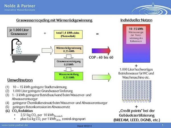 Im Klartext: Das Verfahren des dezentralen Wasserrecyclings in Kombination mit Wärmerückgewinnung holt aus dem häuslichen Abwasser mehr Energie, als zum Betrieb der Anlage benötigt wird. Es wirkt laut Nolde – ganz im Gegensatz zur bisherigen Betriebsweise der zentralen Wasserwirtschaft – durch diesen Energieüberschuss und die damit verbundene CO2-Einsparung positiv auf das Klima.