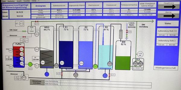 - Unter Verwendung einer geeigneten Wärmepumpe soll zukünftig nahezu der gesamte Wärmebedarf für die Warmwasserbereitung aus der Grauwasserwärme entnommen werden. Voraussetzung dafür ist allerdings, dass die noch bestehenden Zirkulationsverluste minimiert werden.