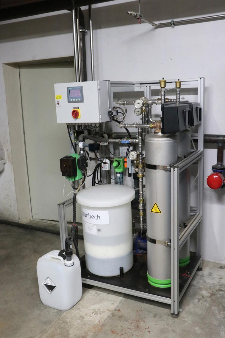 Nach genauer Analyse des Rohwassers am Standort konnte Andreas Voggenreiter eine perfekte Lösung anbieten: „Wir verleihen unseren Kunden eine Umkehrosmoseanlage für die Erstbefüllung des Pufferspeichers. Ein fest installierter Teilstromfilter unserer Grünbeck-varioliQ-Baureihe filtert dann alle im Wasser enthaltenen sowie entstehenden Schwebstoffe, Kalk und Korrosionsanteile aus. Idealerweise – und bei GSW Finningen umgesetzt – wird noch eine Dosiereinheit integriert. Diese bereitet das Wasser mit Natronlauge auf, sodass der ideale pH-Wert von etwa 9,5 gewährleistet ist.“