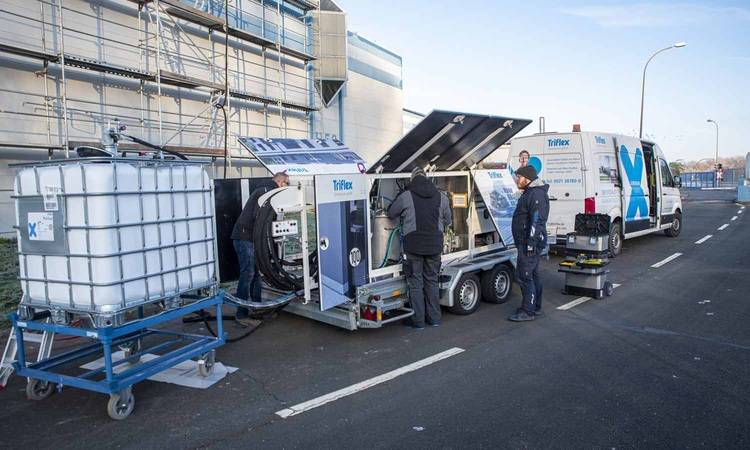 Die innovative 2K-PMMA-Applikationstechnologie von Triflex deckt die Anwendungsbereiche Fördern, Mischen und Airless-Spritzen ab. Da sie kranbar ist, kann sie auch auf Flachdächern und anderen höher gelegenen Bereichen wie Topdecks verwendet werden. Je nach Viskosität des Materials beträgt die Förderleistung bis zu 24 kg pro Minute, und mit einer Schlauchlänge von bis zu 60 Meter sind Nutzungsradius bzw. Reichweite großzügig. Die Pumpe selbst bewältigt eine Förderhöhe von über 20 Meter.