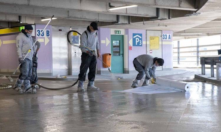 Die 2K-PMMA-Sprayapplikation Triflex Sam ermöglicht im Vergleich zu herkömmlichen Technologien ein bis zu viermal schnelleres Auftragen einer flüssigen Grundierung, Abdichtung oder Versiegelung auf Flächen.