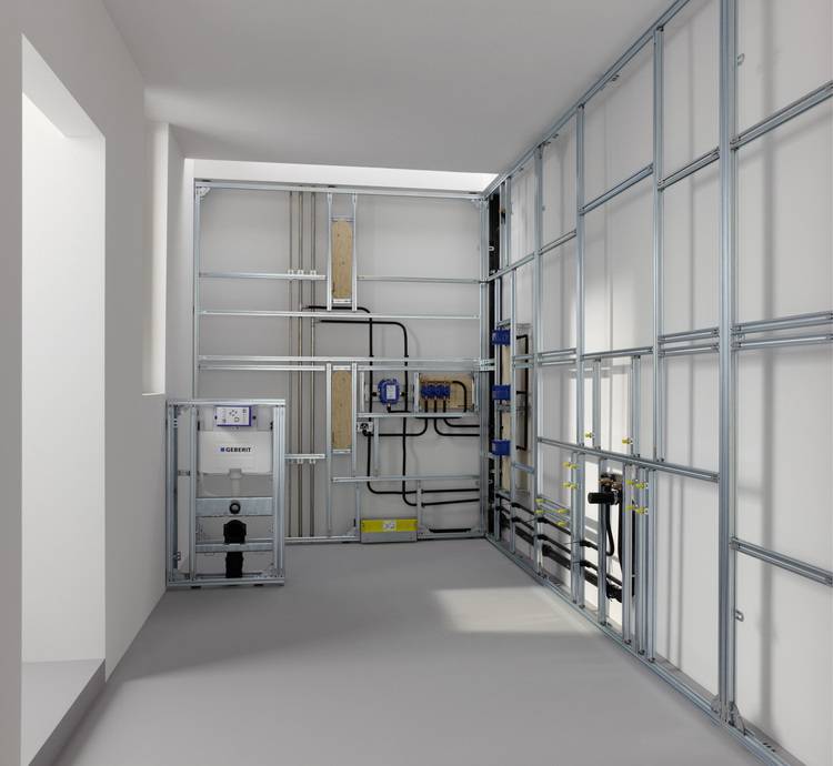 Alle Installationen der Ver- und Entsorgungsleitungen verschwinden – körperschallentkoppelt – in der Wand. Gleichzeitig können praktische Ablageflächen, Nischen sowie Gestaltungselemente, z. B. Insellösungen, halbhohe Raumteiler usw., entstehen. Montageelemente, etwa für WCs, Waschtische, Bidets oder Urinale, werden einfach in das Tragwerk integriert. Anschließend werden zusätzliche Armaturen gesetzt und die Versorgungs- und Entwässerungsleitungen an die Verbrauchsstellen angeschlossen.