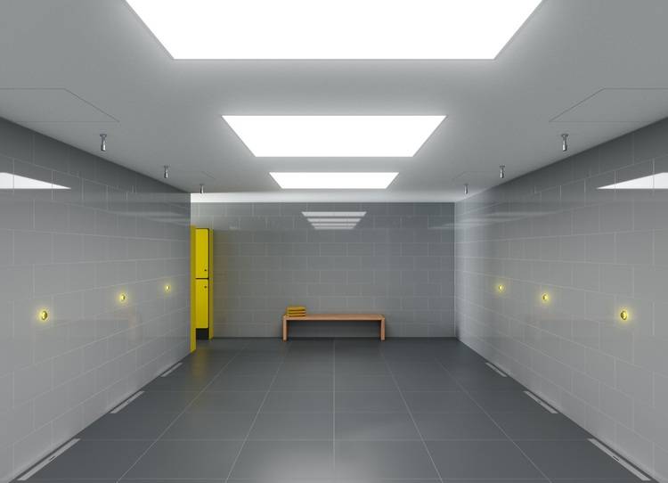 Duschanlage in einer Sportstätte mit „AquaVip-Duscheinheit elektronisch“: Die gesamte Technik der Viega Neuheit ist hinter den Revisionsklappen oberhalb der abgehängten Decke verbaut. Die Reduzierung auf die Kopfbrause und das Bedienelement an der Wand sorgen nicht nur für eine ansprechende Optik. Es erleichtert zudem das Reinigen der Anlage und schützt vor Vandalismus.