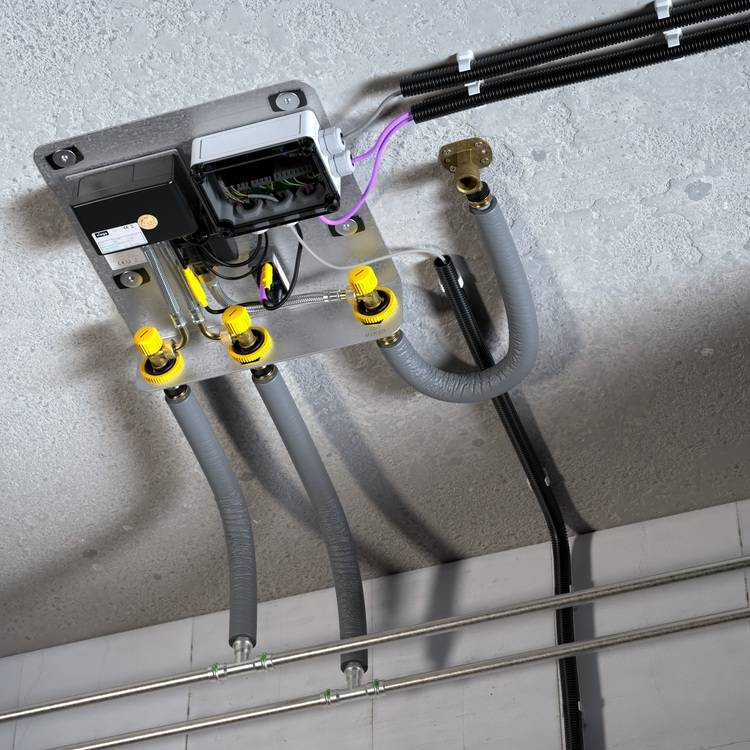Das Herzstück der AquaVip-Duscheinheit elektronisch – die Elektro-Anschlussdose mit Kommunikationsmodul, die elektronische Mischeinheit plus eine zusätzliche elektronische Absperreinrichtung sowie die Eckventile und Wasseranschlüsse – ist auf einer Grundplatte vormontiert. Sie kann ganz einfach hinter einer Revisionsöffnung oberhalb der abgehängten Decke direkt auf der Rohbaudecke oder flexibel an der Wand angebracht werden. Das ist auch im Rahmen von Sanierungen ohne großen Aufwand möglich. Für das Bedienelement stellt Viega eine Abdichtungsmanschette bereit. Weitere Durchdringungen der Abdichtungsebene, wie durch Bohrlöcher, sind nicht erforderlich. Die Verbindung des Bedienelements mit der Mischeinheit ist schnell mit einem steckerfertigen Kabel hergestellt.