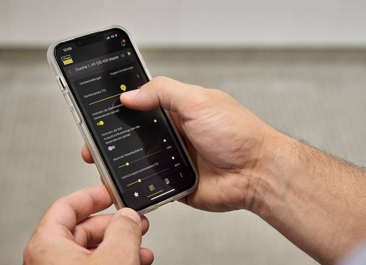 Individuelle Parametrierung der AquaVip-Duscheinheit elektronisch erfolgt via Bluetooth per Smartphone über die App Viega Hygiene Control. Dafür wird ein passendes Bluetooth-Modul benötigt, welches als notwendiges Zubehör die Kommunikationsschnittstelle zwischen der AquaVip-Duscheinheit elektronisch und einem Smartphone und/oder Tablet darstellt. Das Einrichten von Templates vereinfacht die Übertragung der voreingestellten Werte. Die eingestellten Parameter sowie die durchgeführten Spülvorgänge werden in der App prozesssicher abgespeichert. So kann direkt der Nachweis des bestimmungsgemäßen Betriebs der Trinkwasserinstallation geführt werden. Zudem gibt es eine automatische Alarmmeldung, sollten definierte Hygieneindikatoren – wie die Trinkwassertemperatur – nach der Spülung nicht erreicht werden.