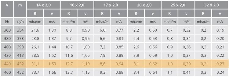 Ein Beispiel lässt wieder die Zusammenhänge deutlich werden: Eine Teilstrecke einer Heizungsanlage besteht aus der langen Kellertrasse von 40 m. Die Anforderung soll sein, dass 440 l/h durch diese Trasse hin- und zurückgeführt werden, also auf insgesamt 80 Meter Rohrlänge. Betrachtet werden soll nur dieser Teil der Anlage.