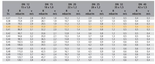 Ein Ablesebeispiel verdeutlicht, was hier beschrieben wird: In einem Rohrstück einer Trinkwasserinstallation von insgesamt 5 m Länge soll ein Volumenstrom von 0,4 Liter pro Sekunde (l/s) transportiert werden.