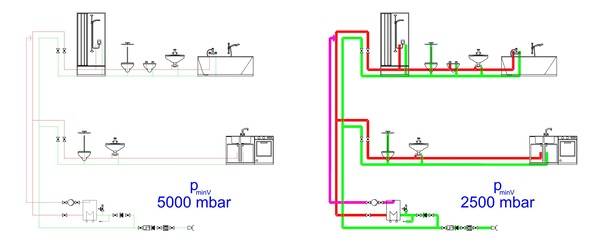Beim Trinkwasser muss man mit dem Versorgungsdruck des Versorgers auskommen. Zusätzlich sollte man Maximalgeschwindigkeiten nach Norm nicht überschreiten. Es sind auch immer hygienische Gesichtspunkte zu beachten.