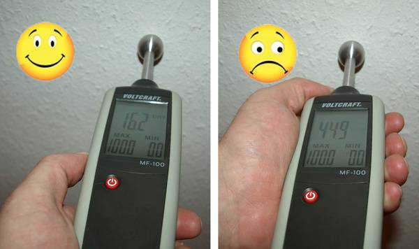 Die handelsüblichen Messgeräte dieses Typs lassen übrigens zu, dass man einen Wert vorgibt, ab dem das Gerät ein akkustisches Signal abgibt. Damit kann man mit einiger Geschwindigkeit auch größere Flächen absuchen. Das Gerät piepst beispielsweise bei einer Überschreitung von 30 Digits und signalisiert damit, dass der Messtechniker hier mal genauer schauen sollte.
