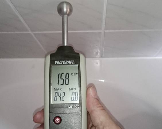 Sie können sich vorstellen, wie der Wert unter einer offensichtlich trockenen Fliese ansteigt, wenn dort das gerissene 15er-T-Stück einen Wasserstrahl in die Wand ableitet. Schon bei einer Annäherung an dieses T-Stück, das immer noch unter der Fliese in der Wand versteckt ist, steigt der Wert kontinuierlich an und erreicht seinen Spitzenwert am T-Stück.