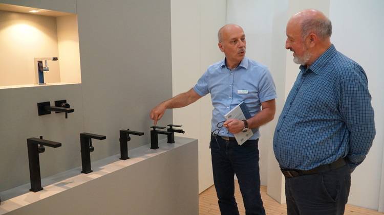 Jörg Reiff, Leiter der Schiltacher „Aquademie“ des Unternehmens, führte den DEN-Vorsitzenden unter anderem durch die Abteilung Strahlforschung. Hier entwickele man „die Zukunft des Badezimmers“, sagte er. Während der heutige Wasserverbrauch beim Duschen in Deutschland bei ca. 15 Liter pro Minute liege, sei es durchaus möglich, auch mit 10 Litern angenehm auszukommen. Man biete auch Duschköpfe an, die nur mehr 6 Liter Wasser benötigten, ohne den Komfort einzuschränken. Dies sei nicht nur in Privathaushalten, sondern insbesondere bei größeren Gebäudeeinheiten wie etwa Hotels ein erheblicher ökonomischer und ökologischer Faktor, erläuterte Reiff. In der unternehmensinternen Forschungsabteilung entwickle man neben wasser- und somit energiesparenden Armaturen und Duschköpfen auch besonders geräuscharme Produkte. Diese würden vor allem von der Kreuzfahrtbranche bevorzugt.
