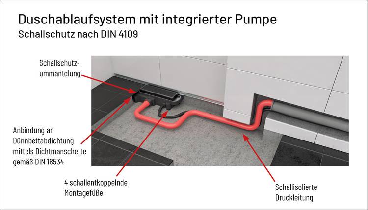 Neben Entwässerungssystemen für Duschbereiche die über Freigefälle funktionieren, werden auch Ablaufsysteme mit integrierter Pumpe in der Badsanierung eingesetzt. Diese sind erforderlich, wenn barrierefreie Duschen gewünscht werden, jedoch die baulichen Voraussetzungen für ein ausreichendes Ablaufgefälle fehlen. Die Herausforderung besteht u.a. darin, die Geräusche der Pumpe gemäß der Schallschutznorm gering zu halten. Ein Beispiel hierfür ist der Plancofix Connect, eine Kombination aus Bodenablauf mit integrierter Pumpe und Design-Duschrinne. Das Gemeinschaftsprodukt von Jung Pumpen und Dallmer entspricht den Anforderungen an den Schallschutz nach DIN 4109.