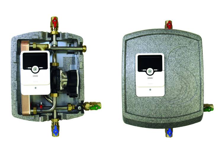 Optional kann das Cosmo -Frischwassermodul auch direkt an dem Pufferspeicher montiert werden. Komplett vormontiert und gedämmt muss das Cosmo -Frischwassermodul nur noch  mit dem Pufferspeicher und dem Trinkwassernetz verbunden werden.