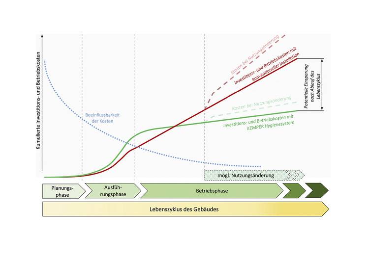 Bild 2: Entwicklung der Lebenszykluskosten bei konventioneller Installation und Installation mit Hygienesystem.