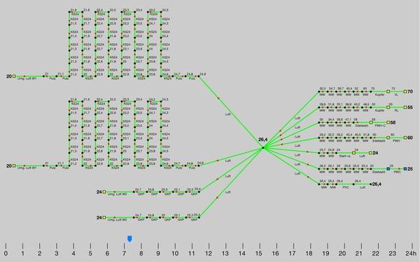 Gerade in Sommermonaten mit langen Hitzeperioden sowie in Räumen mit direkter Sonneneinstrahlung kommen zu den regulären Wärmelasten noch weitere Wärmequellen hinzu. Wird dann nur über wenige Stunden kein Wasser gezapft, erhöht sich die PWC-Temperatur schnell über die kritische Marke von 25 °C. Der hygienische Idealbereich von 20 °C wird kaum noch erreicht. Die VDI-Richtlinie 2050 schreibt daher explizit vor, dass die Raumtemperatur in Technikzentralen mit Trinkwasserverteilungen keinesfalls 25 °C überschreiten darf [10].