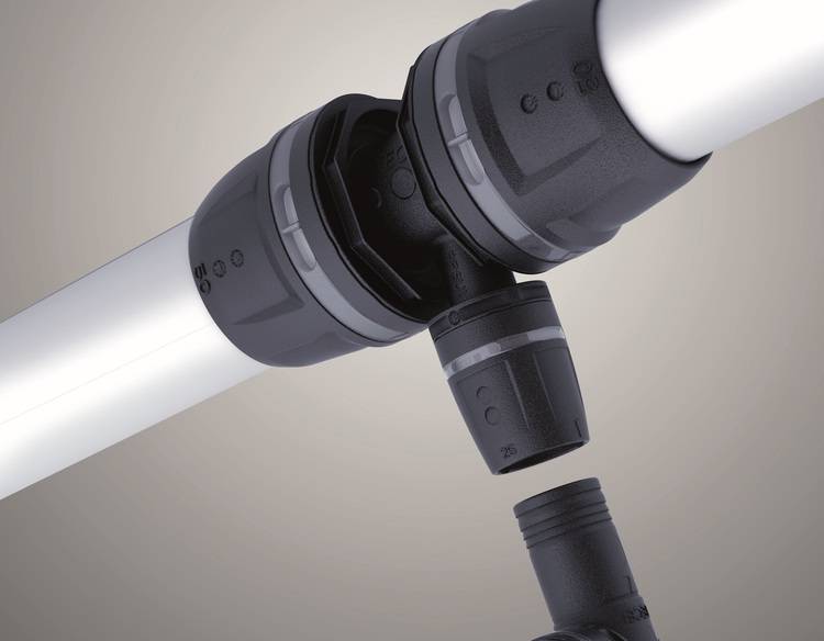 Steckfittings bzw. Steckfittingsysteme (Bild 2) sind in den Werkstoffen ähnlich ausgeprägt wie die Pressfittingtechnologie. Bei einem Hersteller ist der Steckfitting sogar für C-Stahl geeignet, bei einem anderen für PEX-Rohre. Ein Hersteller hat unter anderem ein Systemrohr aus Polybuten im Programm. Vorzugsweise werden kleine Dimensionen von 16 bis 32 mm angeboten. Das prädestiniert den Steckfitting für die Etagenanbindung von sanitären Einrichtungsgegenständen und Heizkörpern in mehrgeschossigen Wohngebäuden. Doch größere Projekte können kaum komplett mit dem Steckfitting realisiert werden. Nur ein Hersteller hat ein System mit MSR-Rohren bis 63 mm im Programm.