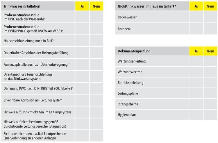 Dazu muss die bestimmungsgemäße Nutzung der Trinkwasserinstallation im Gebäude unter Berücksichtigung der Unterlagen, Aufbau etc. dokumentiert werden. Wenn die notwendigen Unterlagen nicht vorliegen, sind diese auf jeden Fall später noch zu erstellen. Für den Jetztfall sind die notwendigen Informationen durch Befragungen und Inaugenscheinnahme der Anlage zu besorgen (Bild 2). Dabei ist die Installation auch auf die Einhaltung der allgemein anerkannten Regeln der Technik (a.a.R.d.T.) hin zu überprüfen.