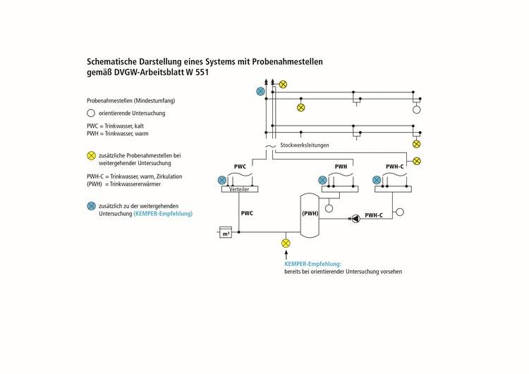 Diese Untersuchung ist zwingend erforderlich zur Eingrenzung der tatsächlichen Kontaminationsquelle. Hier werden auch Proben an stagnierenden Strecken wie beispielsweise an Sammelsicherungen oder Membranausdehnungsgefäßen genommen (Bild 4). Es wird empfohlen, die für die weitergehende Untersuchung vorgesehene zusätzliche Beprobung im PWC (Trinkwasser kalt) grundsätzlich bereits bei der orientierenden Untersuchung vorzunehmen. So kann eine Kontamination aus dieser Richtung frühzeitig identifiziert werden. Die Tabellen 1a und 1b des DVGW W 551 enthalten sowohl Vorgaben zu den erforderlichen Schritten einschließlich Untersuchungen als auch Fristen für deren Umsetzung.