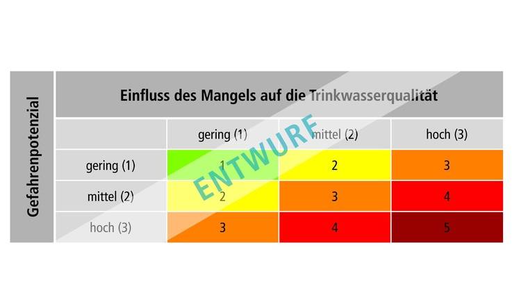 Die Gesamtbewertung erfolgt über die Einzelanalyse der verschiedenen Auffälligkeiten. Diese Auffälligkeiten können mit der Risikomatrix Bild 5 bewertet werden. Dabei wird einerseits Risikopotenzial für die menschliche Gesundheit, andererseits die Auswirkung des Mangels auf die Trinkwasserqualität bewertet. Hier noch einmal die Begriffsbestimmung aus der TrinkwV: Im Sinne der TrinkwV ist „Gefährdungsanalyse“ die systematische Ermittlung von Gefährdungen der menschlichen Gesundheit sowie von Ereignissen oder Situationen, die zum Auftreten einer Gefährdung der menschlichen Gesundheit durch eine Wasserversorgungsanlage führen können, unter Berücksichtigung: