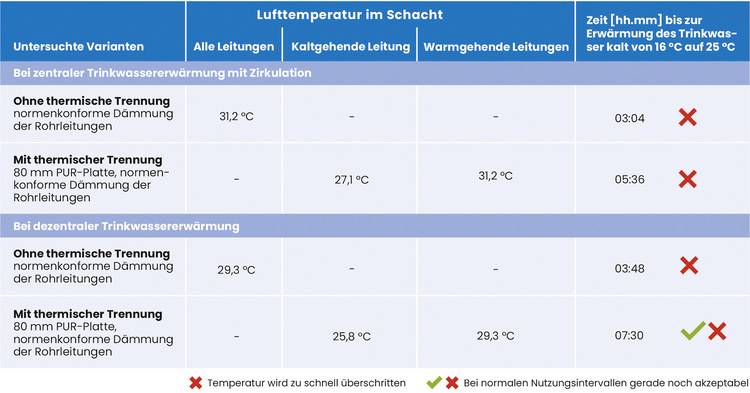 Das zeigen am Prüfstand im Uponor Experience Center in Haßfurt durchgeführte Messungen. Dabei wurde eine klassische Schachtbelegung mit einer verglichen, bei der die Kaltwasserleitung durch eine 80-mm-PUR-Platte von den warmgehenden Leitungen thermisch getrennt wurde. Zusätzlich erfolgte eine Unterscheidung nach Art der Trinkwassererwärmung: eine zentrale Trinkwassererwärmung mit Zirkulation und eine dezentrale Trinkwassererwärmung.