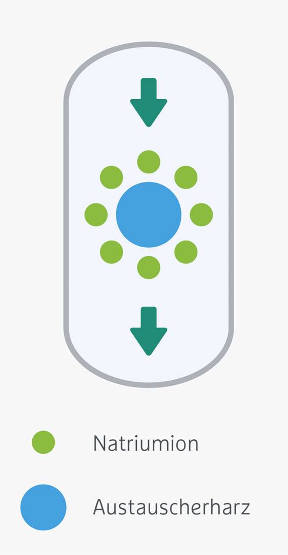 Bei der Enthärtung von Trinkwasser mittels Kationenaustausch werden die im Trinkwasser enthaltenen härtebildenden Calcium- und Magnesiumionen gegen Natriumionen ausgetauscht (Bild D). Dieser Austauschprozess findet so lange statt, bis das Kationenaustauscherharz erschöpft ist und keine Natriumionen mehr zur Verfügung stehen.
