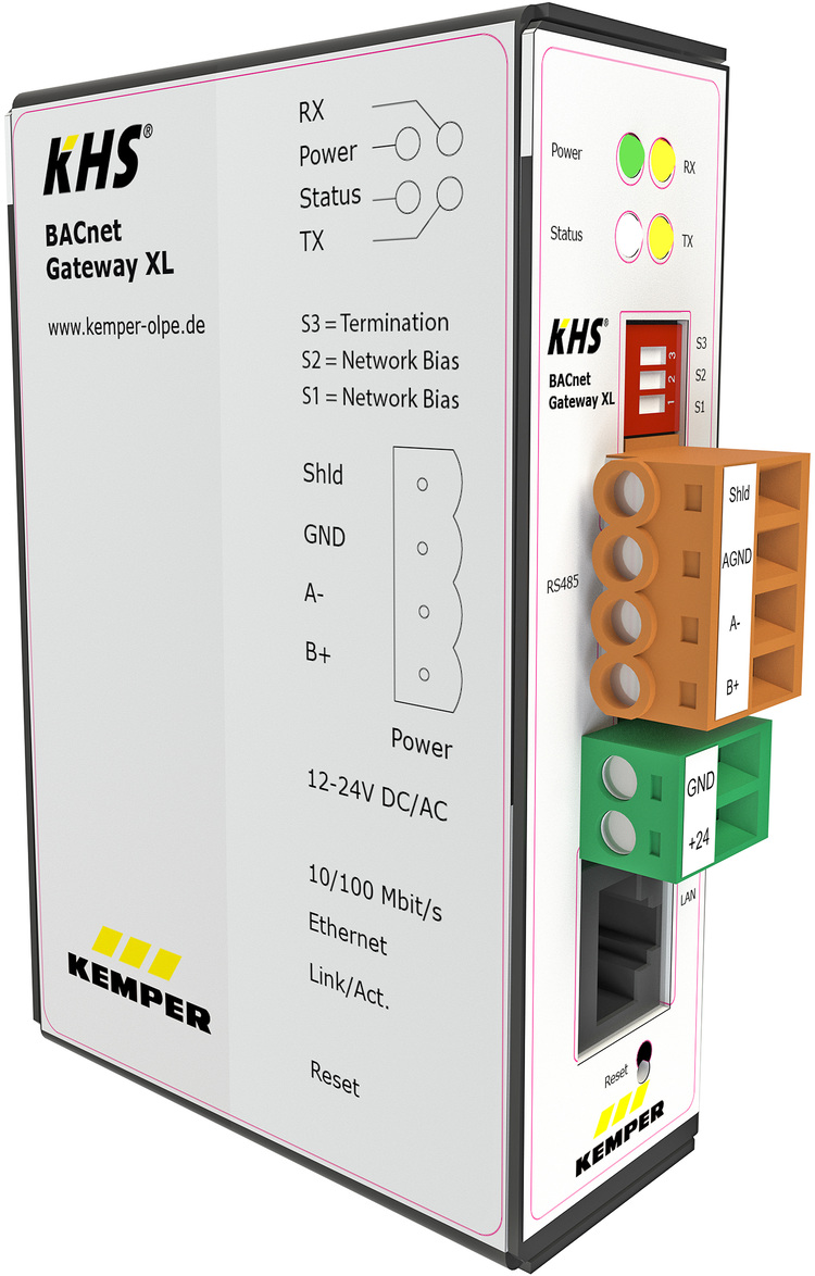 Für die alternative Anbindung über den Protokollstandard BACnet steht das „KHS BACnet Gateway“ zur Verfügung. Damit ist eine Kommunikation über BACnet IP oder BACnet MS/TP möglich.
