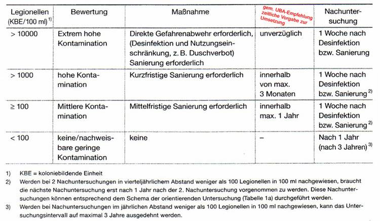 Aufgrund dieser extrem hohen Befunde mussten nach der Bewertung in Tabelle 1b des DVGW W 551 (A) unverzüglich Sofortmaßnahmen zum Gesundheitsschutz der Nutzer getroffen und sämtliche aerosolbildenden Entnahmestellen mit endständigen, bakteriendichten Sterilfiltern ausgestattet werden.