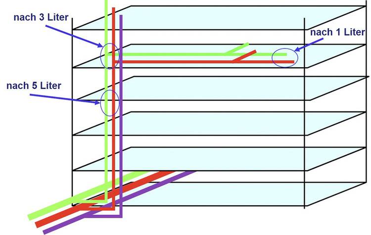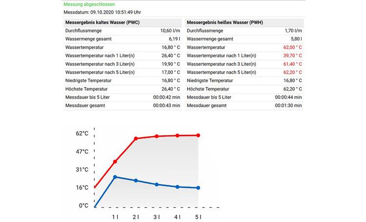 Die Temperaturmessung nach 1 l erfasst dann das bereits wieder abgekühlte Wasser aus der Einzelanschlussleitung, die Temperaturmessung nach 3 l misst die Temperatur der Verteilleitung bzw. am Anfang der Einzelzuleitung am Strang und nach 5 l wird dann die deutlich erhöhte Temperatur aus der Steigleitung erfasst (Bild 3).