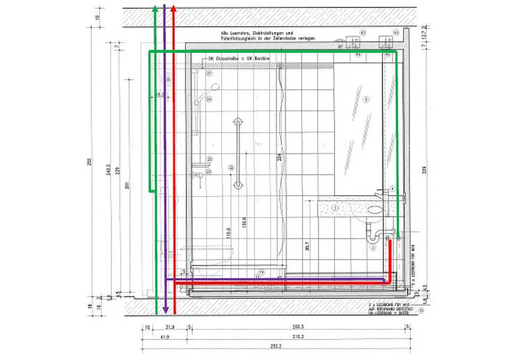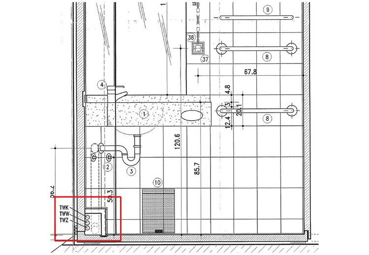 Der Ausführungszeichnung des Kabinen-Erstellers war zu entnehmen, dass die Leitungen in den Sanitärkabinen im Auslieferungszustand mit einem Flexrohr installiert wurden, das mit einer 4-mm-Umhüllung versehen wurde.