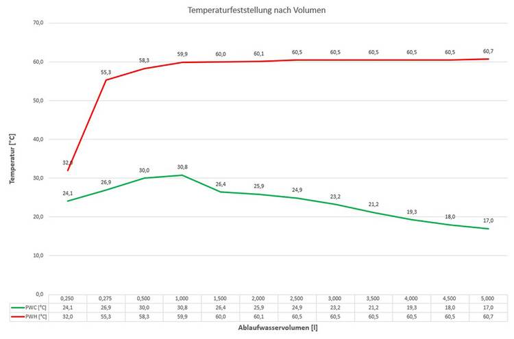 In vielen Trinkwasserinstallationen ist festzustellen, dass die Kaltwassertemperatur, nach 1 l gemessen, tatsächlich unter 25°C liegt, in der Regel werden hier Temperaturen analog zur Umgebungstemperatur gemessen. Nach 3 l gemessen ist eine Temperatur von 25°C oft überschritten und nach 5 l ist dann bereits ein oft deutlicher Anstieg der Temperatur zu verzeichnen.